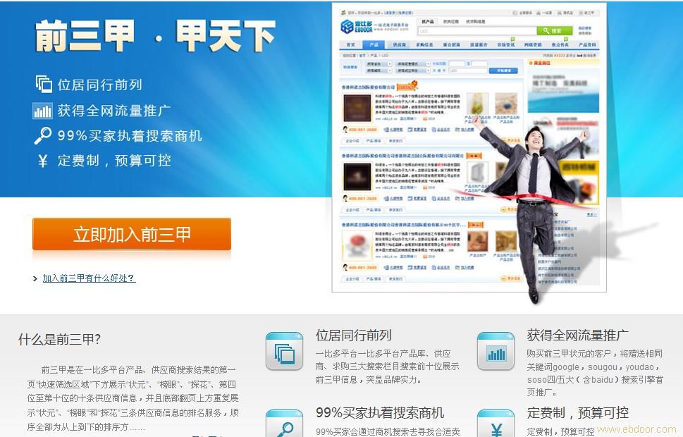 前三甲是在一比多平台产品、供应商搜索结果的页"快速筛选区域"下方展示"状元"、"榜眼"、"探花"、第四位至第十位的十条供应商信息,并且底部翻页上方重复展示"状元"、"榜眼"和"探花"三条供应商信息的排名服务,顺序全部为从上到下的排序方式。从第四页开始不再展示该排名服务,其它前三甲推广位从第二页开始不展示排名服务。同时,在一比多平台求购信息搜索结果的页"快速筛选区域"下方和底部翻页上方对"状元"、"榜眼"、"探花"进行再次展示,顺序全部从上到下。从第四页开始不展示此排名服务。